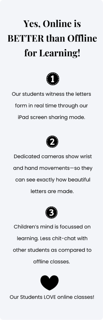 Yes, Our students love online classes ❤️They watch letters form in real time through our iPad screen sharing mode.Dedicated cameras show wrist and hand movements—so they can see exactly how beautiful letters are made.Watch it live in action in the video!
